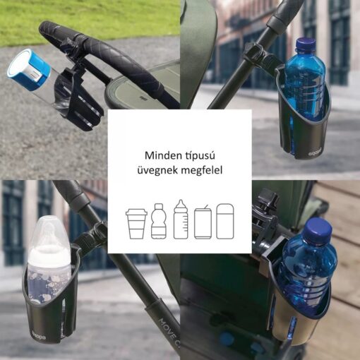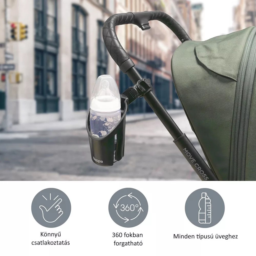 A legtöbb babakocsin, valamint gyerekbiciklin, játék babakocsin stb. használható palacktartó. A befogópofák fixen tartják a cumisüvegtartót a helyén, és a nyomógomboknak köszönhetően a tartó a kívánt szögbe állítható. A tartó könnyen rögzíthető, illetve levehető.